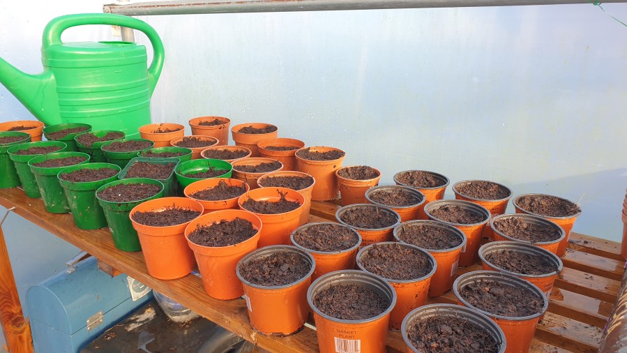 And so(w) we’re off: with the sowing of some 40 pots of sweet pea seed, and a tray of Redbor Kale seed the new allotment year is well and truly begun on monsterinthecorner. Over 30 different varieties of seed has been purchased, timber for the replacement raised beds is ordered, and the fencing lats are being measured and shaped. Fish,blood and bone meal together with potash and lime have all been sourced, and with the soil drying out a little at last we’ve even managed to turn some sod.